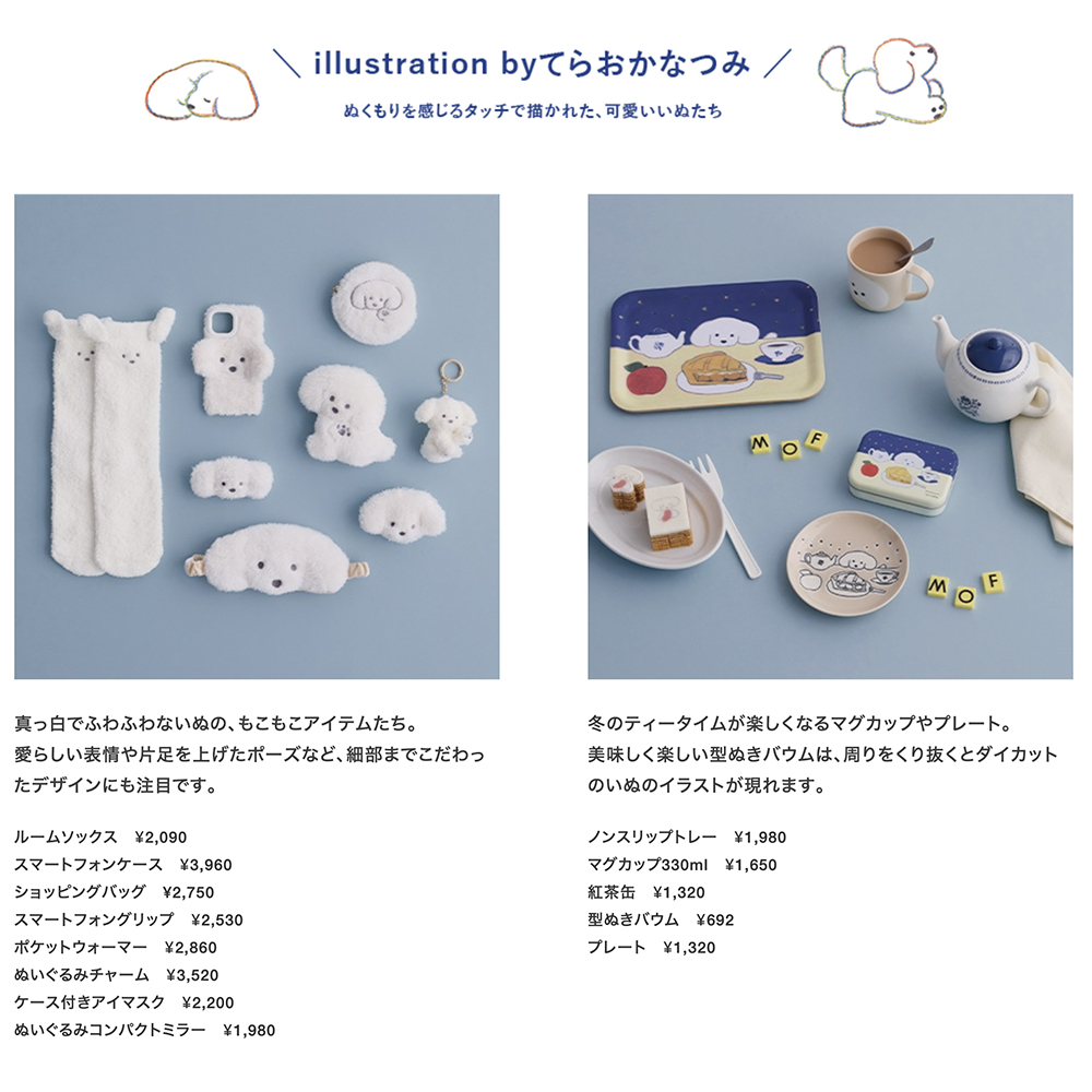 オリジナルグッズは、蔦屋書店オンラインストアでも9月24日(水)より予約受付を開始し、10月6日(月)より発送します。てらおかなつみさんの柔らかな世界にぜひ触れてみてください。(蔦屋書店HPより)