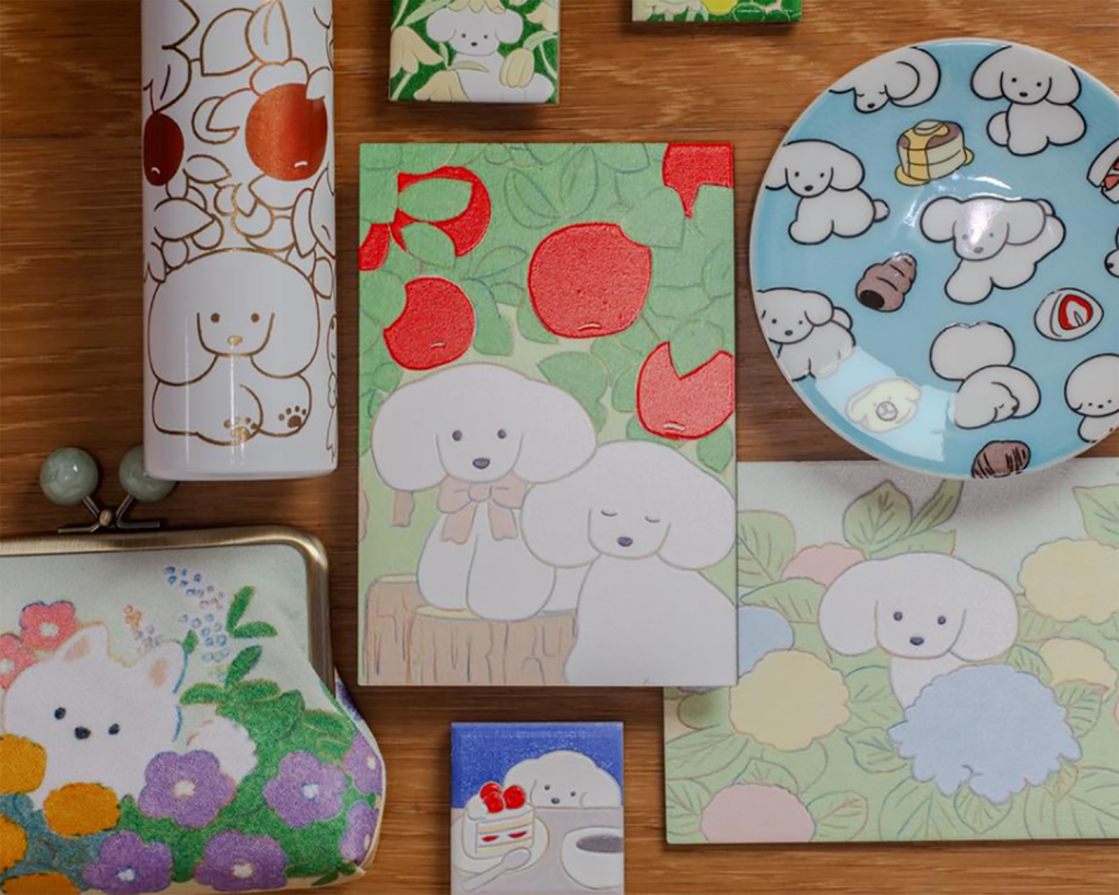 作品展では、原画作品(一部店舗)やジークレープリント作品、作品集のほか、マグネットやお皿、ウッドポストカードなど、てらおかなつみさんのオリジナルグッズも販売します。犬を中心とした動物が柔らかなタッチで描かれたイラスト作品と併せて、日々を共に過ごしたくなるグッズをどうぞお楽しみください。