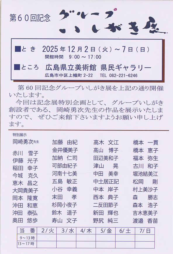 創造表現コース設立に尽力された、元美術科教諭平岡秀樹先生の師匠(岡崎勇次先生)が設立したグループの展覧会。平岡先生もいしがき会に所属し生前は講師も務められていました。